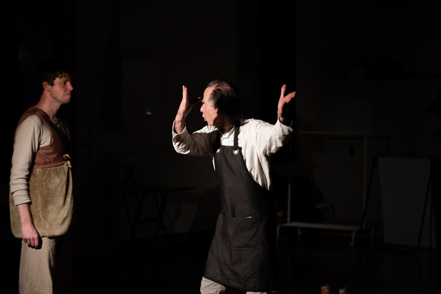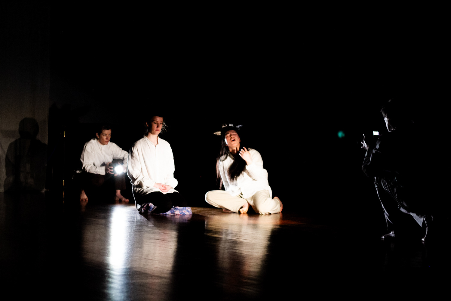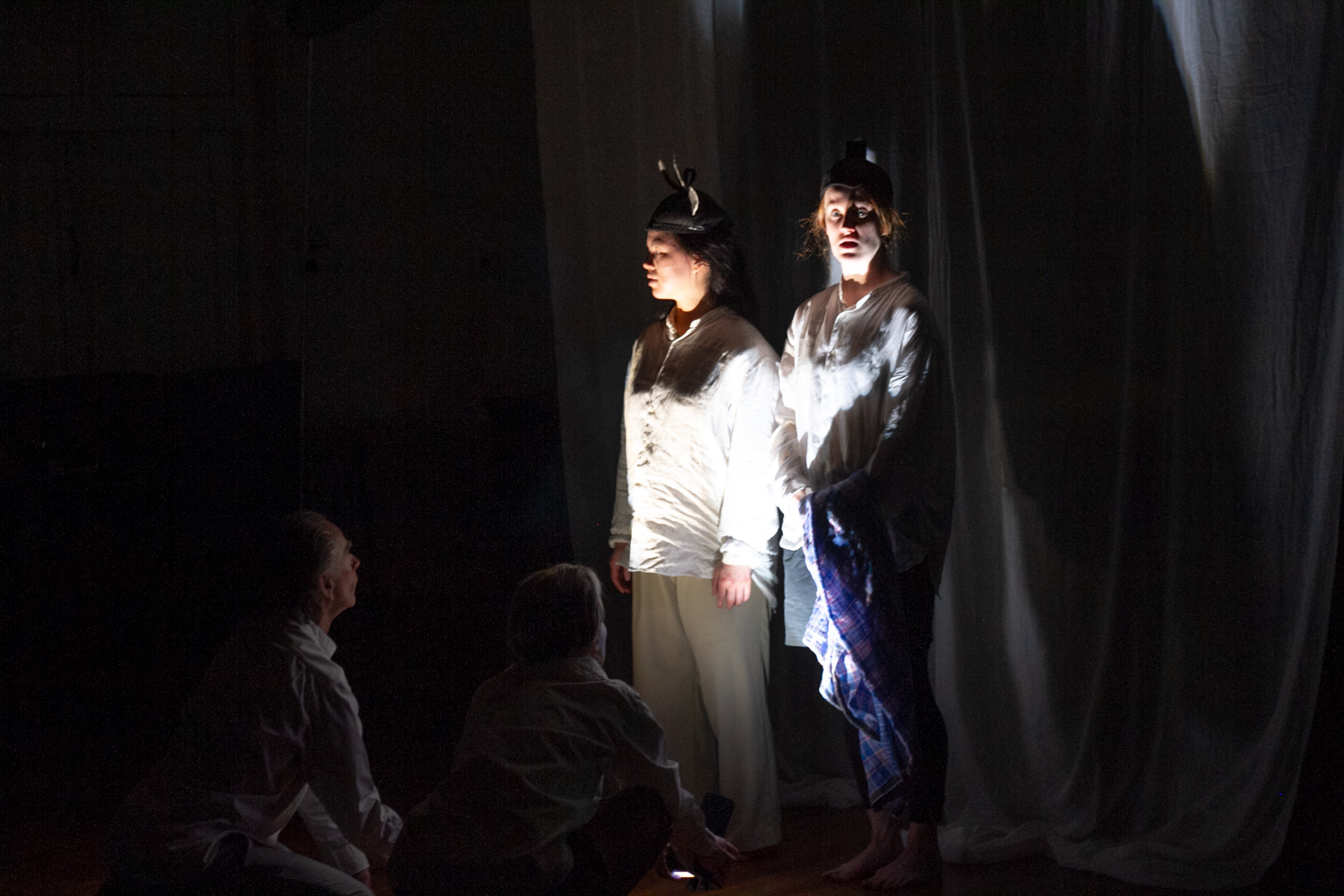 Synopsis: Falling Heads is a co-devised theatre performance arising from Akutagawa Ryunosuke's 1917 wartime story. The performance follows two tribes with common roots, the People of the Sunflowers who colonise the lands of the People of the Wild Boars. In a Brechtian fabled style, the story centres on estranged twin siblings: Steph, a Sunflower regime sympathiser and her twin brother Tomasz, a poet dissident of the Wild Boars. In embodied scores, dialogue, sculptural battlefield reportage and folk acapella, the Sunflower authoritarian ideology of Cartesian 'pure thought' overcomes the Wild Boar sensory experience of the world. The oracle foretells the split, the Sunflower captain conducts conversion therapy, the shopkeeper runs resistance, the twins meet in death, the Sunflowers cover ancient graves—ultimately, the Reporter asks why any history should not be questioned.