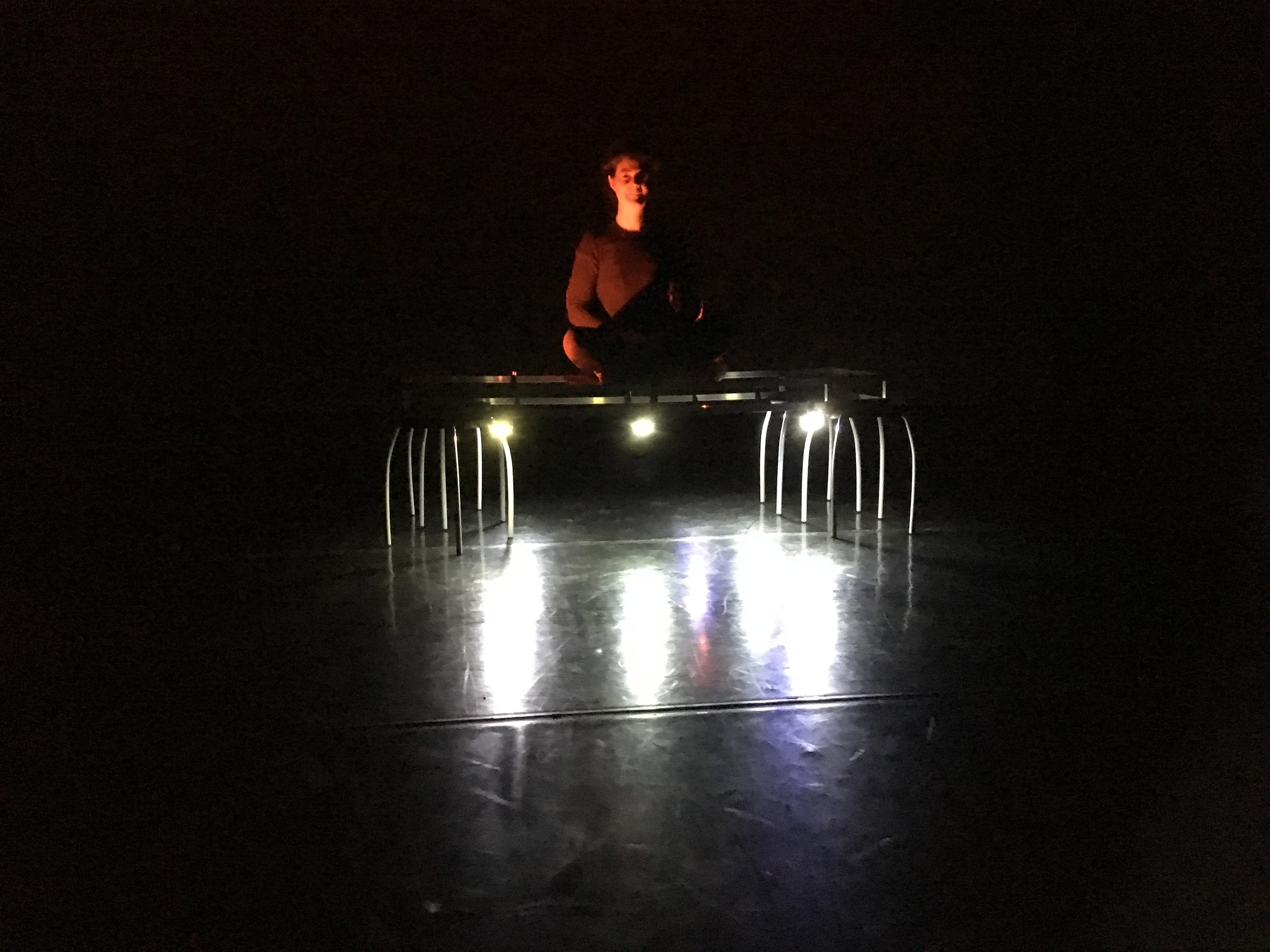 Another example of bringing parts of the play into training was the analysis and practice of a super-slow sideways walk, which the chorus performs during the central-character Josephine’s Waterfall speech. We worked with the image that the chorus moves as fluid. Feet parallel facing front, the centre moves same-speed sideways. Because the weight transfers across the narrow of the foot, there is a moment in such a walk when the upper-body falls as the feet reposition. Once more resistance was essential to maintain control, but so too the attenuation of the feet. We experimented with different approaches: slow-centre/fast-feet; smaller strides; turn-out, lower centre, and we reminded ourselves of the importance of outward foci to the front as well as in the direction of travel. Such slow movement matched with the Josephine Waterfall speech created a strong impression on our audience–as the chorus closed on her, the sediment of our practice experimentation and the focus required just to walk, created the threat the story demanded.